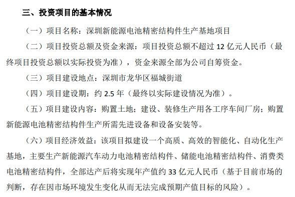 公告天气,该项目拟建设一个高质、高效的智能化、自动化生产基地,全部达产后将实现年产值约33亿元人民币(基于目前市场的判断,存在因市场环境发生变化从而无法完成预期产值目标的风险)。